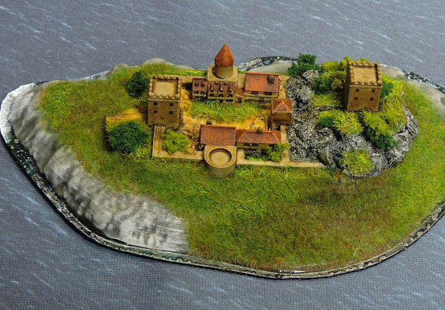 I have several new scenarios coming up for the 17th century naval campaign. I needed something that resembled a Scottish castle. I thought - just a tower. Then, what about a tower on a rocky outcrop? Then that morphed into... maybe I could expand it to look like the stronghold of a clan chief with outbuildings etc.. yeah...