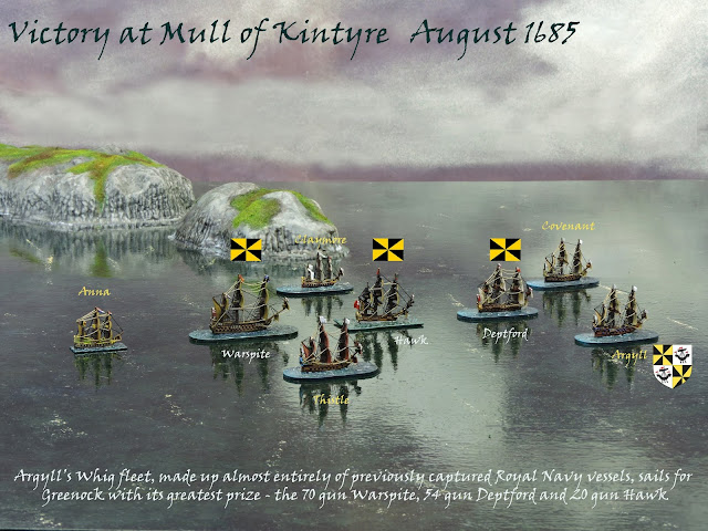 In the battle off Mull of Kintyre, Argyll managed the incredible feat of capturing a 70 gun ship - Warspite, together with the 54 gun Deptford and 20 gun Hawk, leaving Herbert to beat a hasty retreat in his flagship Royal Katherine. Where do we go from here? All for the loss of not a single ship.