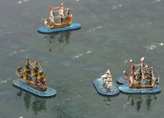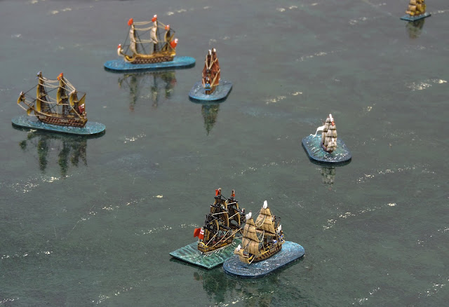 The players have fulfilled their roles magnificently. Dave has had tremedous dice luck and Colin appalling dice luck but, Dave has also made some bold moves at the right time which won him great prizes. All actions have had equal points values and the smaller Whig ships have carried better crews simulating not superior seamanship but higher levels of motivation to win - if the lose they are for the gibbet! I will report on the next amazing adventure of the rapidly expanding Whig Fleet soon.