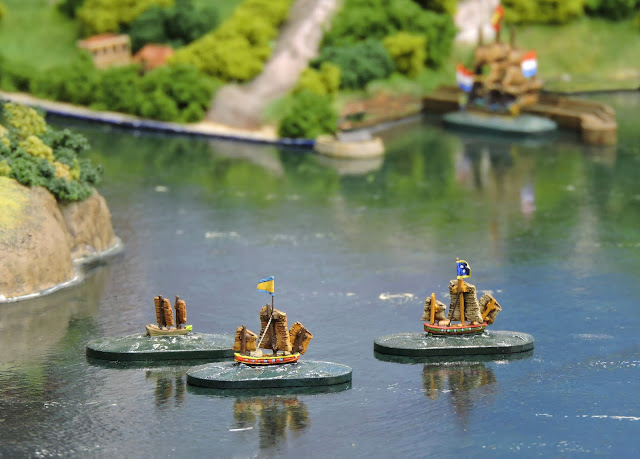 Some of the larger engagements I have already started to cover in smaller scales. This battle between a lone VOC 50 gun ship and a swarm of junks was great fun and ended in a Dutch victory. Completed im 1/2400 scale.