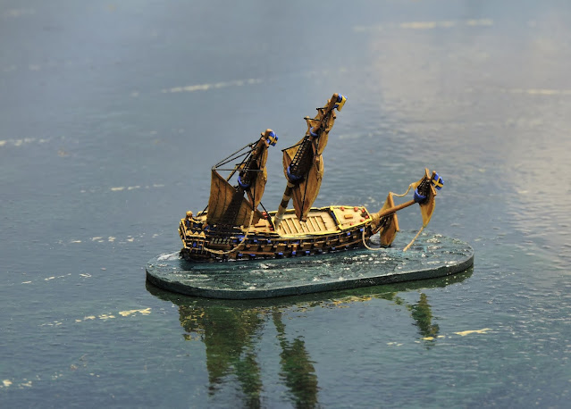 I have used the Ark Royal Miniatures ship Royal Sovereign which was of compatible size. I carefully filed her hull at a angle and used milliput to model her below the waterline shape. The paint job is pretty standard as is the rigging. Assembling and rigging her at an angle on the base has been an interesting activity but as you can see from these WiP shots, the whole thing is coming together. The base is wider than usual to accommodate the angle she is lying at and protect the masts and rigging.