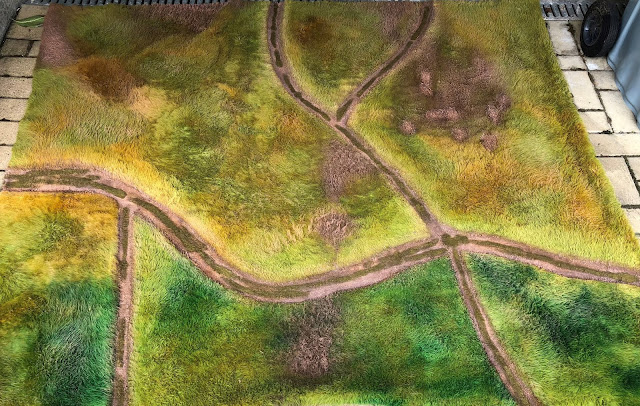 Having let that dry on the washing line in the evening sun, my final acts were to put grass centres down the roads using static grass glued with PVA, emulsioned and dry brushed (paint job circa 10 minutes) and doing and overall dry brush of the entire mat with the Tuscan Roof paying particular attention to road verges to lighten them up.