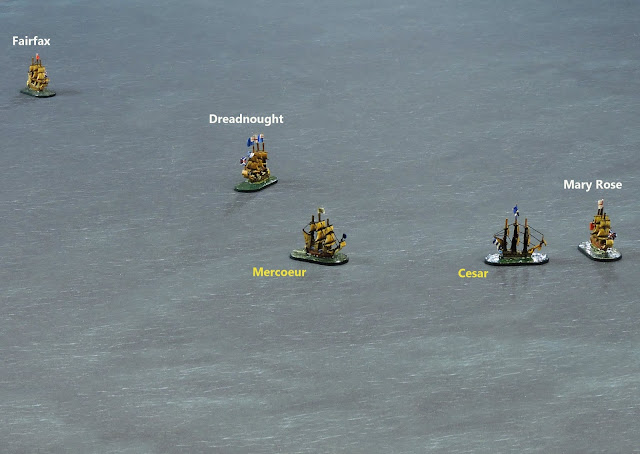 Barre in the Dreadnought, had left Portsmouth without taking on powder and ball so could not afford to engage in a prolonged exchange. Fairfax under Captain Robert Salmon was undermanned and also in an unenviable position were it to come to battle. The César had even less ammunition than the English flagship so neither commander harbours intentions of a full blown engagement.