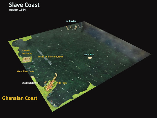 Admiral de Ruyter is still on foreign service. Following his outstanding triumph in freeing two VOC vessels from internment at the hands of the tax greedy English, he has moved on to a somewhat more challenging mission. The United Provinces want to consolidate their hold on the African slave and ivory trade. To do that, they want to destroy an Arab port at the mouth of the Volta river. OK so far however, there are a few impediments to commercial success namely.. a very large and well-gunned ex-Portuguese fort and the matter of several ship loads of angry Berber corsairs who fancy a Dutchmen between two slices of bread for lunch. Colin picked up the mitten as de Ruyter deputizing for Peter Douglas. He made a wonderful de Ruyter!