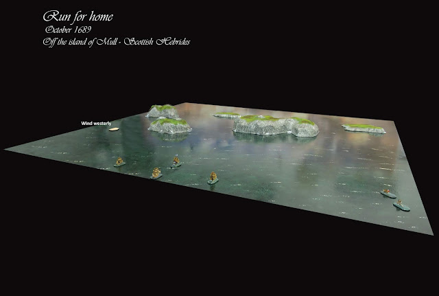 Scenario number 2 called 'One thousand Irish' sees our eponymous hero Vice Admiral O'Brien, shielding a transport fleet which is disgorging two infantry battalions on the west coast of Scotland to reinforce Viscount Dundee's loyal army. Whilst this logistical challenge is underway, a powerful coastal fleet arrives under the Dutch admiral Akkerman. These Williamite ships are hell bent on disrupting the landing and eliminating the covering force of Jacobite Irish warships. The powerful currents of Scotland's Atlantic coast played a significant part in this battle and Dave actually got to command his own squadron which was nice.