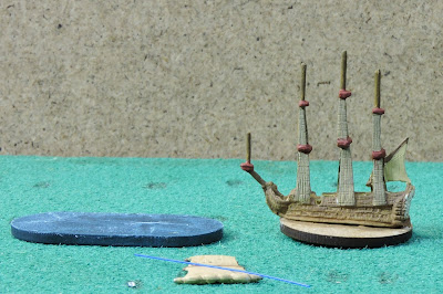 Flat colour application, stern detail as yet not done. Note the rigging plastic strips I use. |