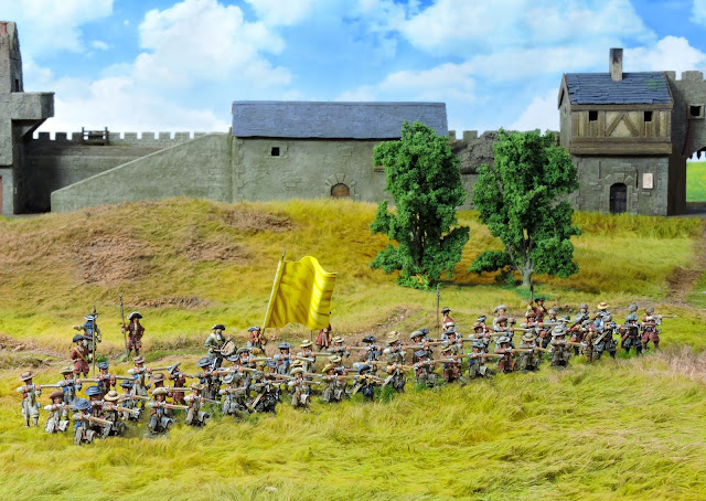 | Three 48 man companies of musketeers from the garrison of Derry. A company of Mountjoy's Regt at the centre. |