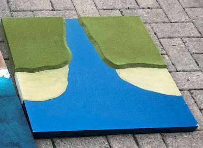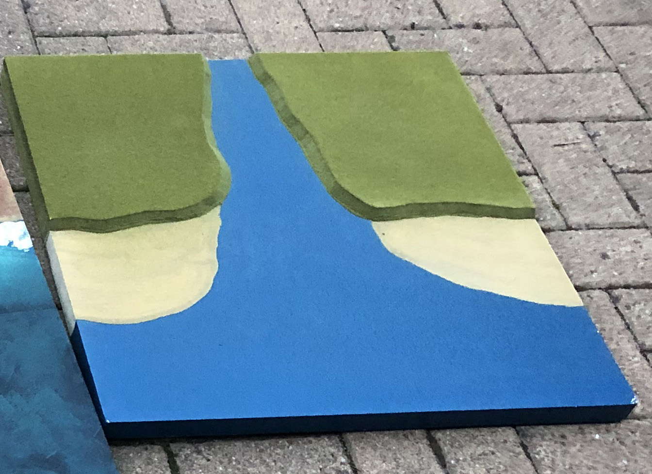 I did no cutting. Everything is paint and a little plaster to create rocky coastline, surf and a trackway which in smaller scale will appear like a drover road or similar. I used tubes of acrylic and my blending method with sponges to get the water effect. I decided not to varnish in the end as the boards had a slight sheen anyway.