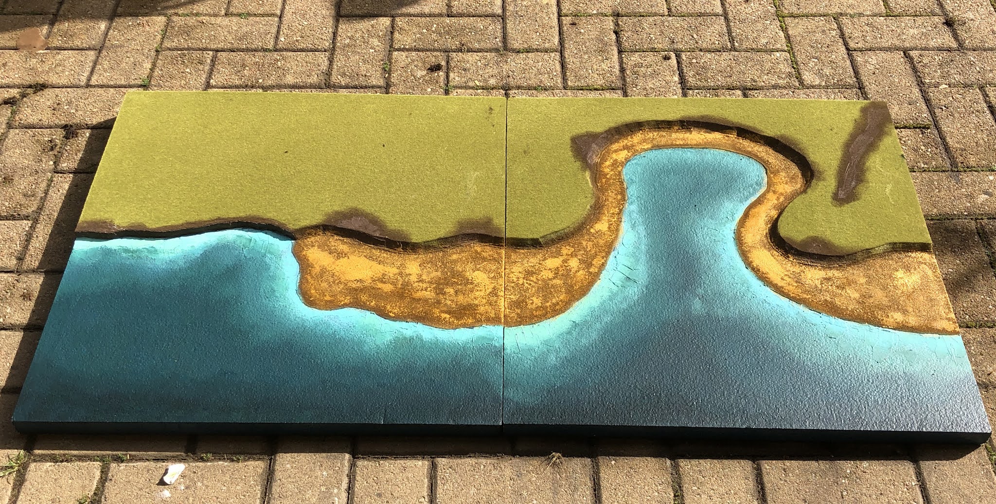 I covered the land areas with static grass and did my usual treatment afterwards with emulsion paint which gives a nice rich effect. The beach areas which on the tiles are already covered in a sandy coloured fibre, I sprinkled with fine sand and repainted in a higher contrast style in keeping with the rest of the board.