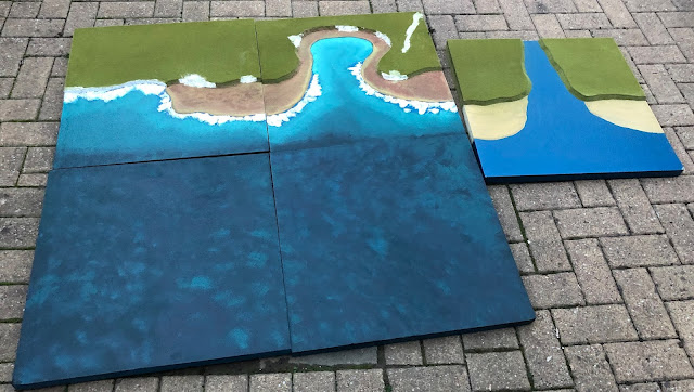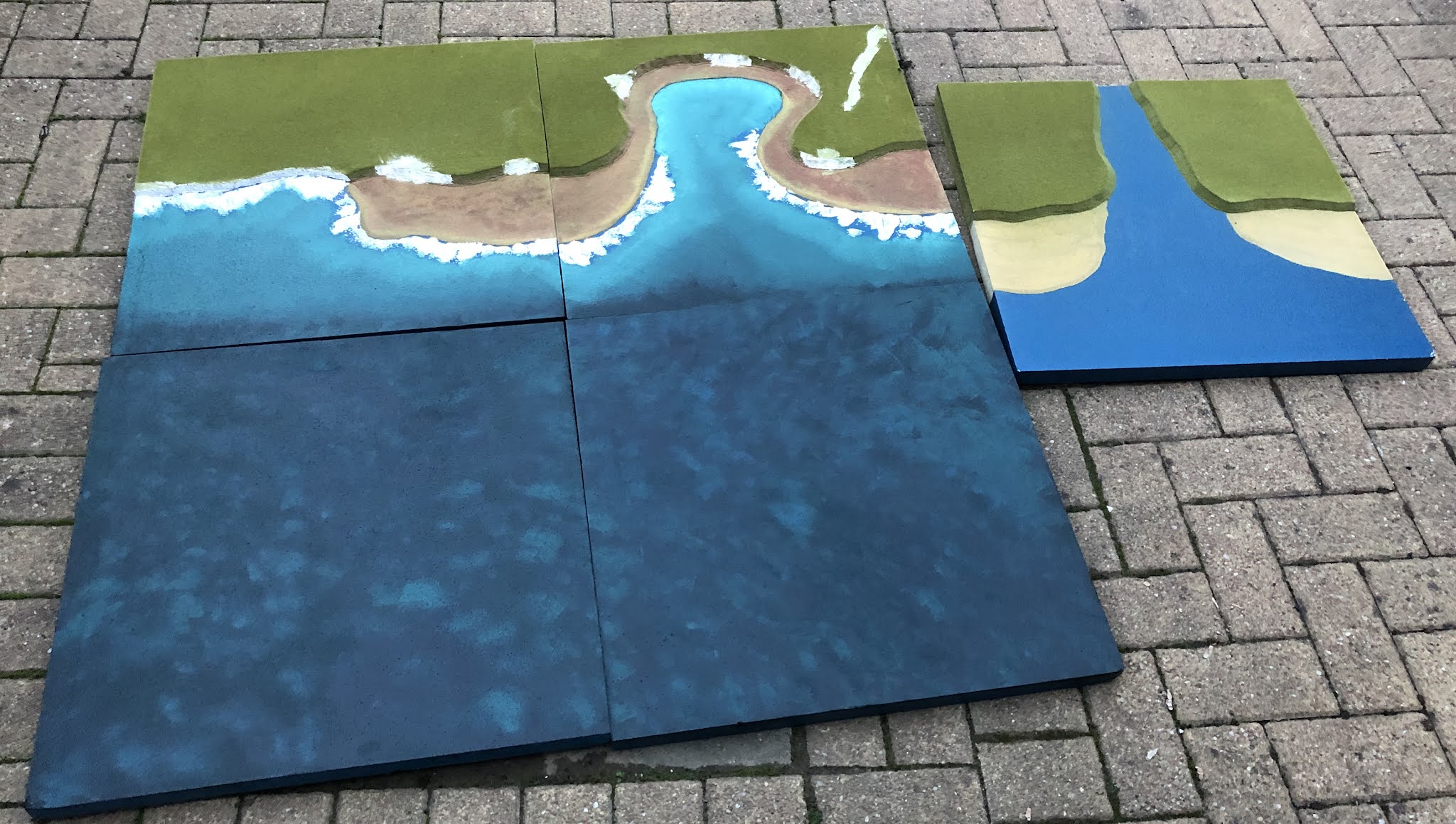 TSS tiles do a job but their vanilla banality which is their greatst strength is also their greatest weakness. These boards were an experiment in that I wanted them to look good for locationas as diverse as the Caribbean, The Scilly Isles, The south coast of England and South East Asia. Obviously, a few compromises were necessary but the main theme was coastline with shallow water over a sandy bed thus some bright clear colours near the shore.
