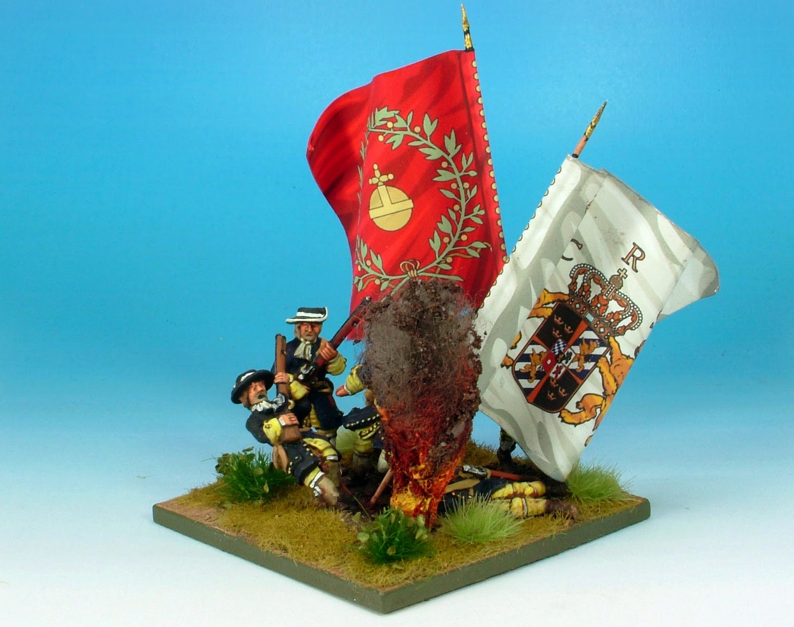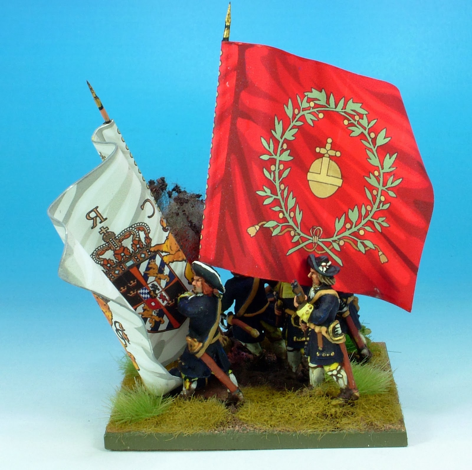 I didn't have time to do flags from scratch and I knew these boys would have their first outing against Gunter Heim's Saxons so I use the Uppland flag designed by Clarence. It fits rather nicely I think and I may just leave it in place when the blonde boys take the field in Flanders pre 1697.