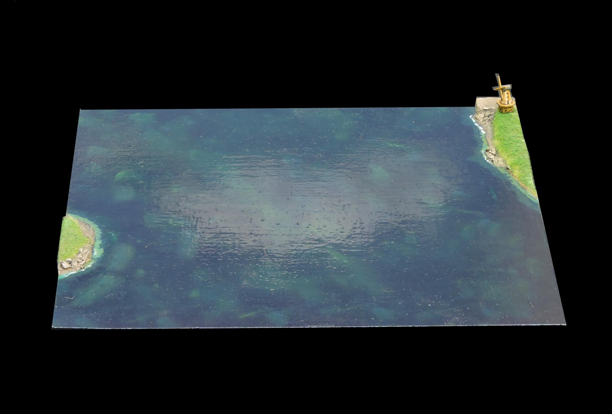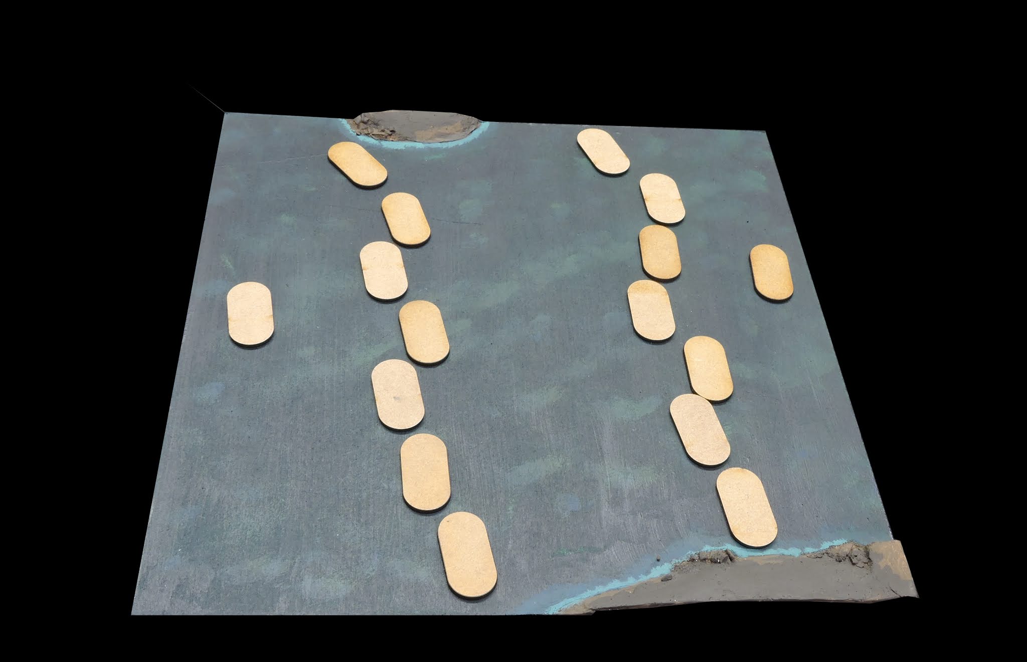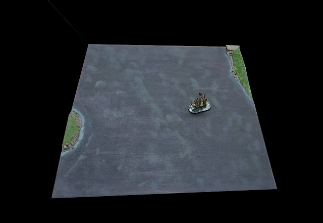 Step 1: ships marked out on 12 x 12 inch tile. Terrain already modelled |
