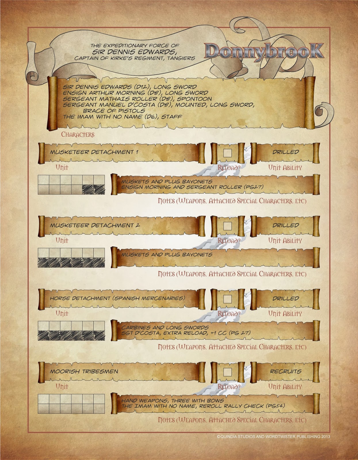 Here is the force roster sheet for Donnybrook so you don't have to break the spine of the book to photocopy it! It should be self explanatory, but I've included a second sheet filled in so you can see where everything goes. There are twelve boxes to record the number of models in each unit - if the unit has fewer than twelve models, simply black out the extras (duh). You can record casualties in pencil to keep an eye on when you need to test for the End of Game. Use pencil to record when the unit has fired in the 'Reload?' box. Obviously if you are playing with more than four units, you will need two roster sheets...