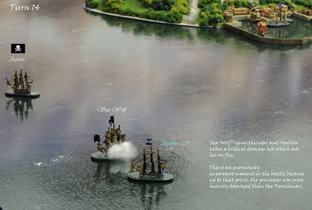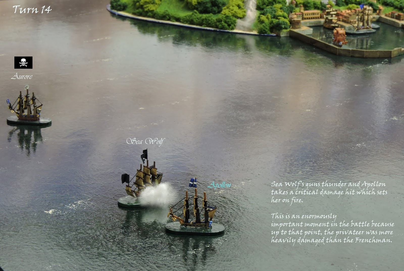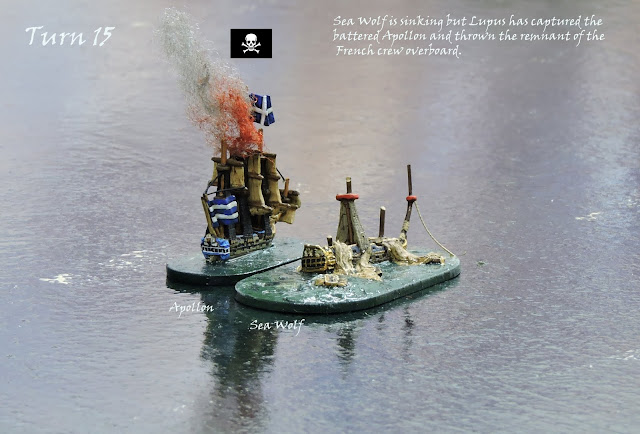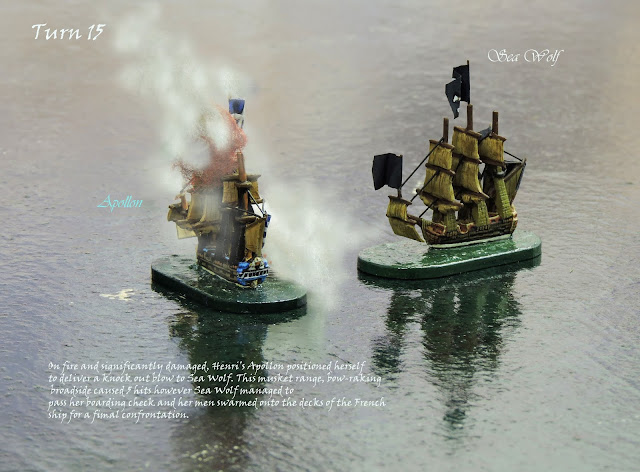 Net +1 to Sea Wolf. She had a single remaining strength point whilst Apollon had 6. Although the privateer won the combat decisively, she sustained a single damage point and thus was completely disabled. The surrender of the French crew allowed the privateers to transfer to the captured vessel.