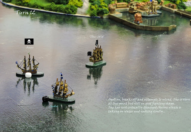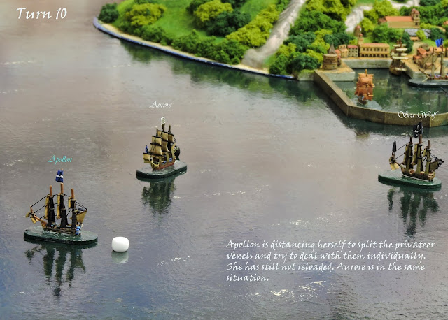 With both privateers to windward, Henri aboard Apollon attempted to put distance between his ship and the enemy allowing his heavy guns time to reload. During Turn 11 an opportunity arose for Henri to attempt to grapple and board the now isolated and wounded Aurore but, this was botched leaving the two ships sailing parallel at less than 30 yards apart.