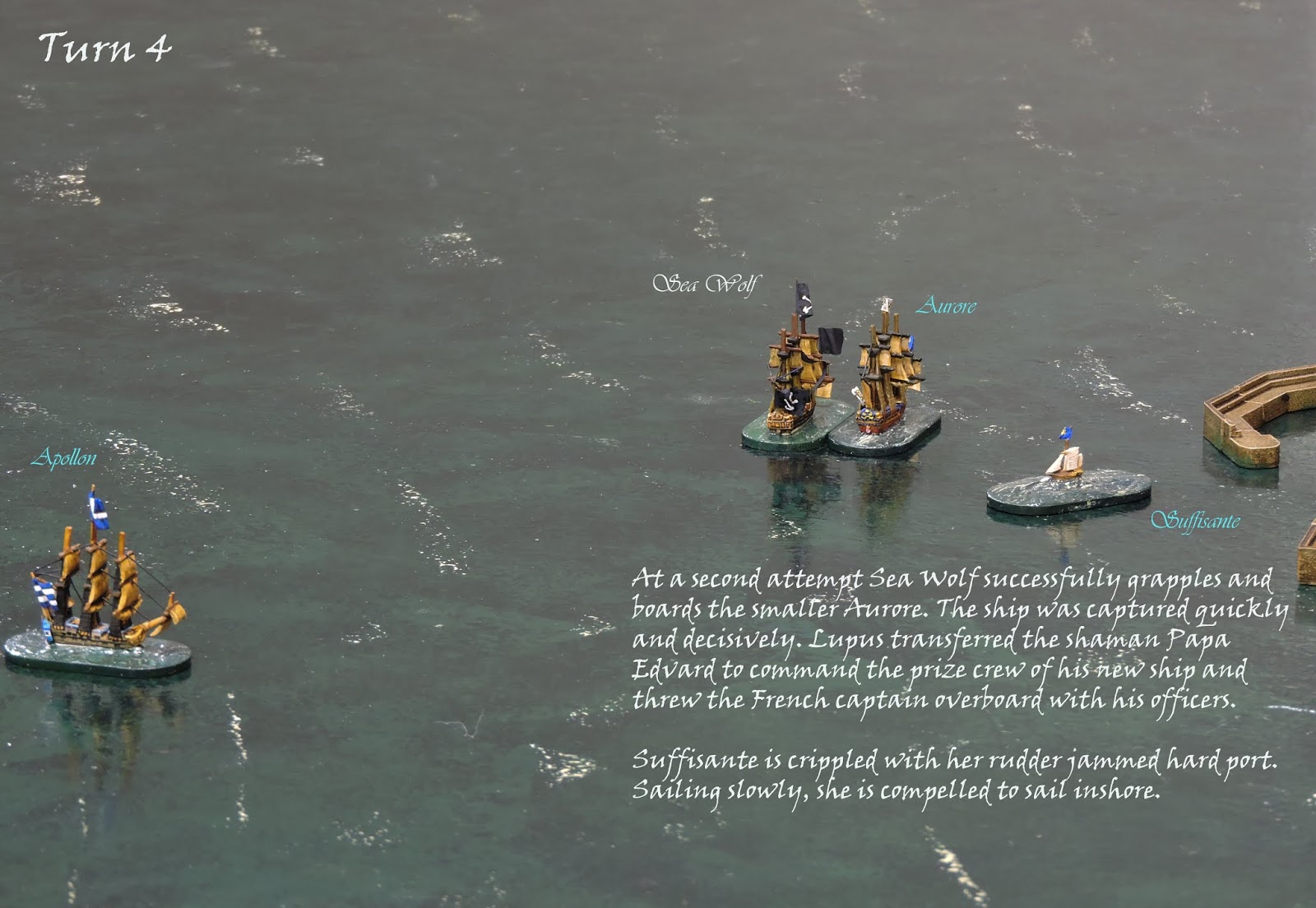 Winning initiative again on Turn 3, Sea Wolf badly bungled a boarding attempt on Aurore which was a golden chance missed. This allowed Aurore to slip out to sea only to be replaced by Sufficante whose Veteran crew repeated the process by loosing their first shots into the privateer at musket range. This rash act was met with lethal force. Lupus returned the favour shooting his powerful first broadside into the small craft and scoring 5 hits.