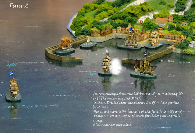 Sea Wolf headed inshore on T1 and no shooting occurred. On T2 Aurore emerged straight across the bows of the pirate ship and at musket range, raked her. This lightly gunned vessel could potentially have caused a critical hit by scoring with three dice but only managed two hits.