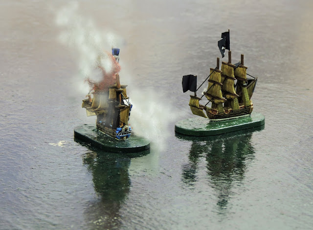 The French colonial force is identical in points terms to the previous two forces however, I have used Jean Baert's privateer Maure to deputize as the 40 gun Apollon mastered by Captain Henri, a Crown sponsored pirate himself. His other vessels are the 20 gun Aurore and the 12 gun Suffisante.