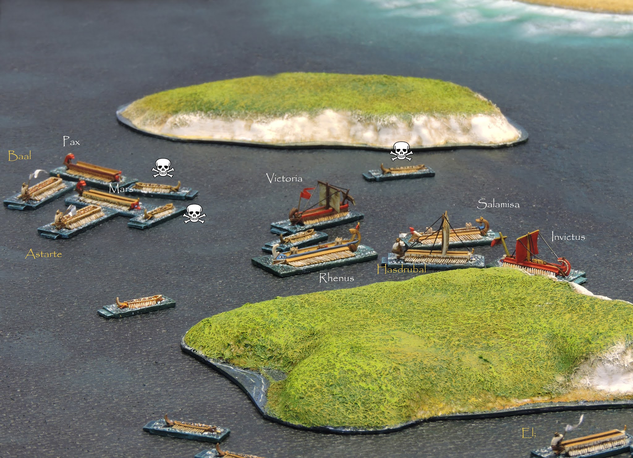 Some turned and tried to navigate to the south through the channel in which the empty Concordia drifted. Roman attacks in the tight channels had by this time managed to capture or incapacitate three transports. Invictus eventually overwhelmed the enemy flagship capturing the Carthaginian admiral. Pax was captured by Baal but the crew of Mars triumphed over Astarte. The Roman ship had been so badly damaged be the enemy ram that they abandoned their crippled vessel and took to the Astarte which they had some difficulty in freeing from the wreckage of their own abandoned vessel.