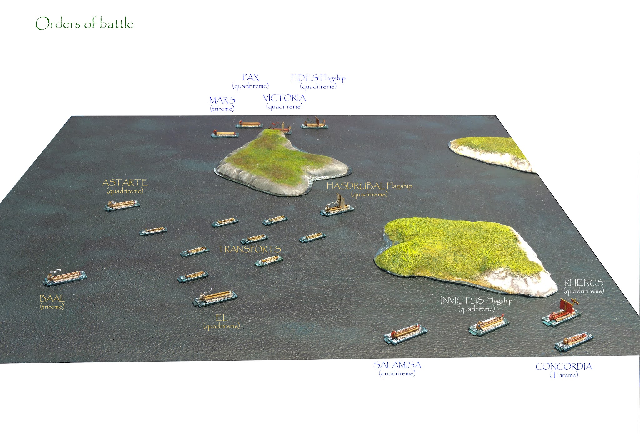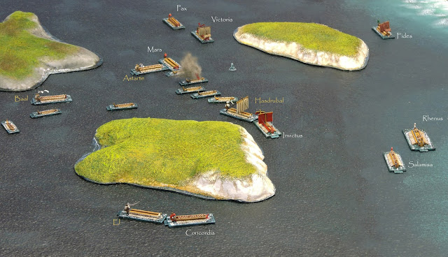 The Carthaginians pushed their flagship through the main channel and to the south whilst bunching the supply ships in the anchorage between the islands. The Roman group to the north headed inshore to block the entrance to the bay whilst the flag squadron to the south, moved to interdict the convoy. Attacks came quickly. The Roman admiral Anonymus used his large flagship Invictus to ram the Carthaginian flagship Hasdrubal.