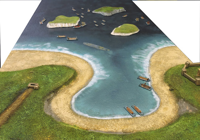 Victory conditions for Carthage are to get at least 4 transports (from 8) successfully to the shore inside the bay. Two additional anchored ships are readying for sea in the bay. They will activate when each reaches a specific accumulated number on die throws per turn.
