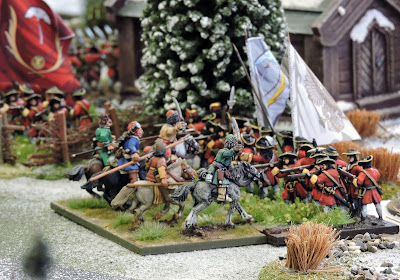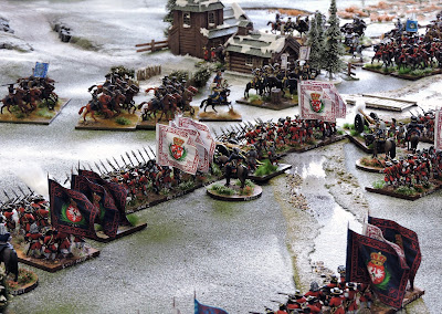 Gunter Heim re-flagged some of his Saxon battalions to provide the Russian contingent. The terrain was Adrian's and the use of some Woodland Scenics snow scatter really created the right effect.
