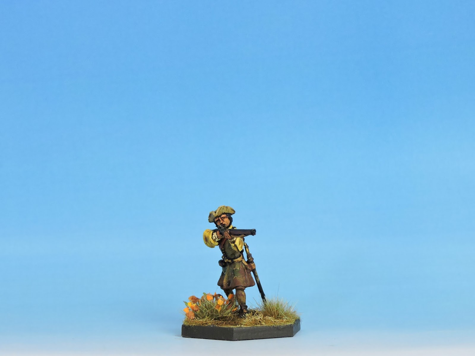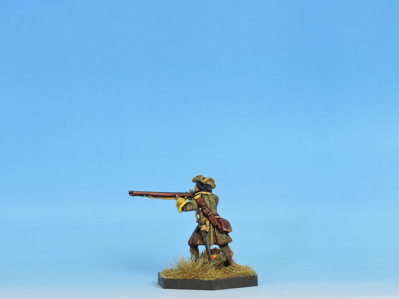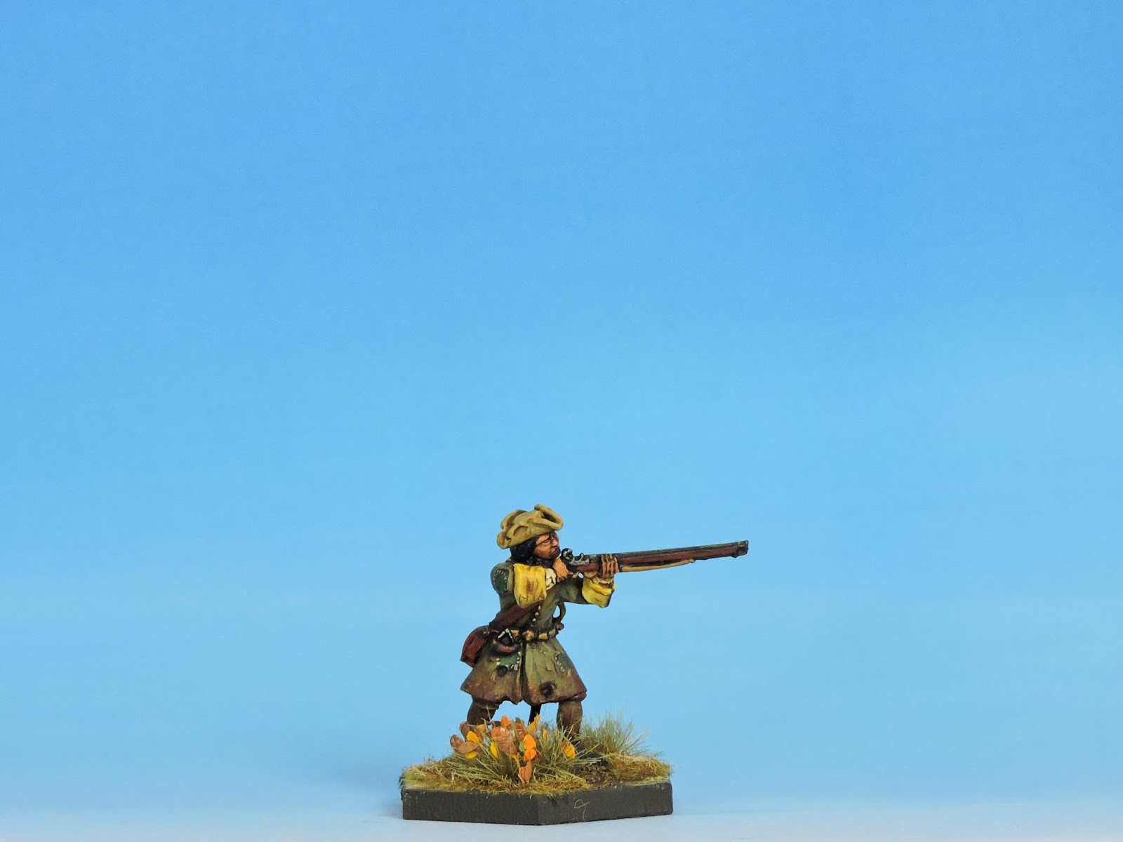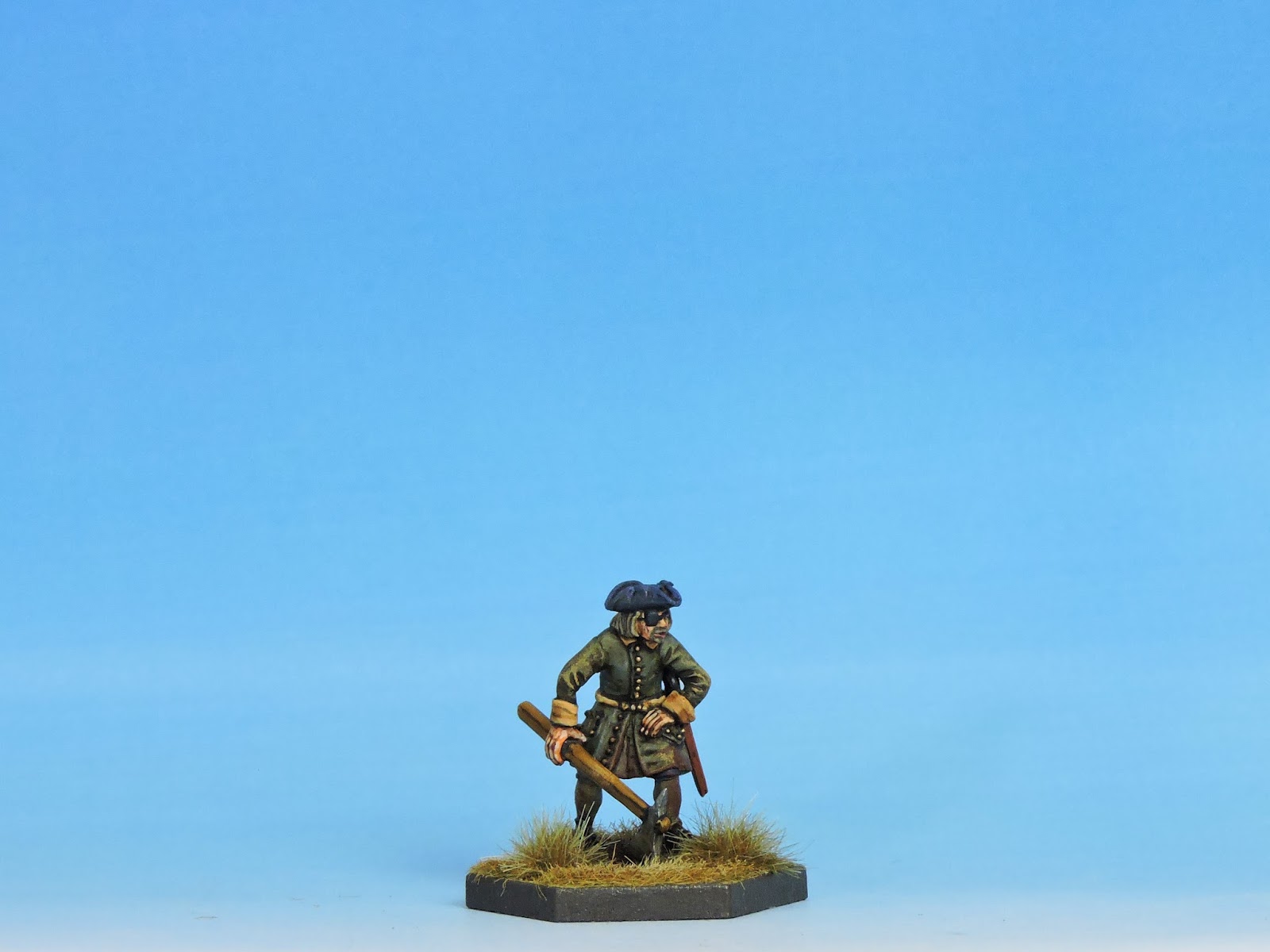 The final character attached to the Vikings is a sniper. He is a Russian musketeer from R1. He has a very small addition to convert him to a Swede - a coat collar. His buttons have been removed form the cuffs and a hand drill and clippers have roughed up his coat. He has removed his turn backs. His name is Lukas Ström.
