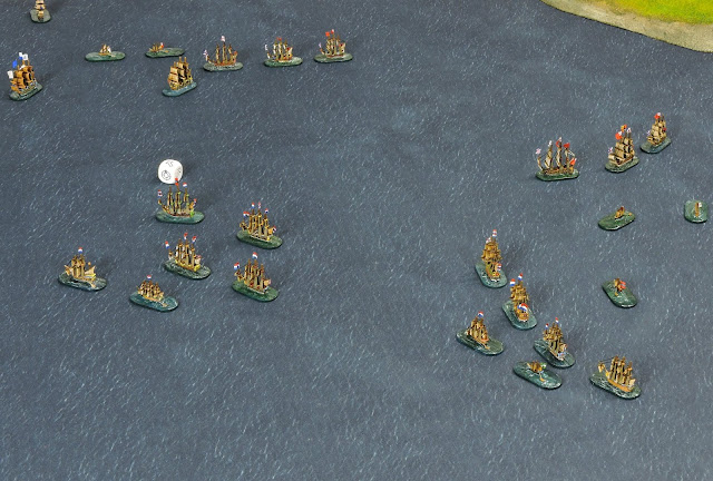 Work has been pretty all consuming of late and I have been promising myself a gaming treat for a while merely as a little carrot to keeping me wading through the grind. The naval rules have been growing in detail and feel and during my travels. A point system and some of the random elements which I like to incorporate in rule mechanics to remove player control have been added and I wanted to road test both. The collection of ships is now over sixty of all sizes and nationalities so, on Friday night I planned the battle that I wanted to fight on the following day when everyone was out and I could throw dice, take pictures and notes to my heart's content.