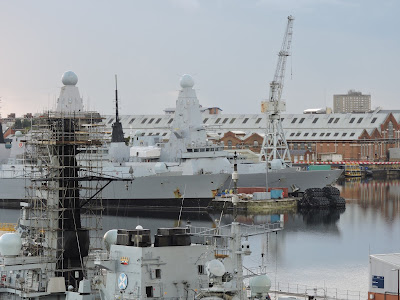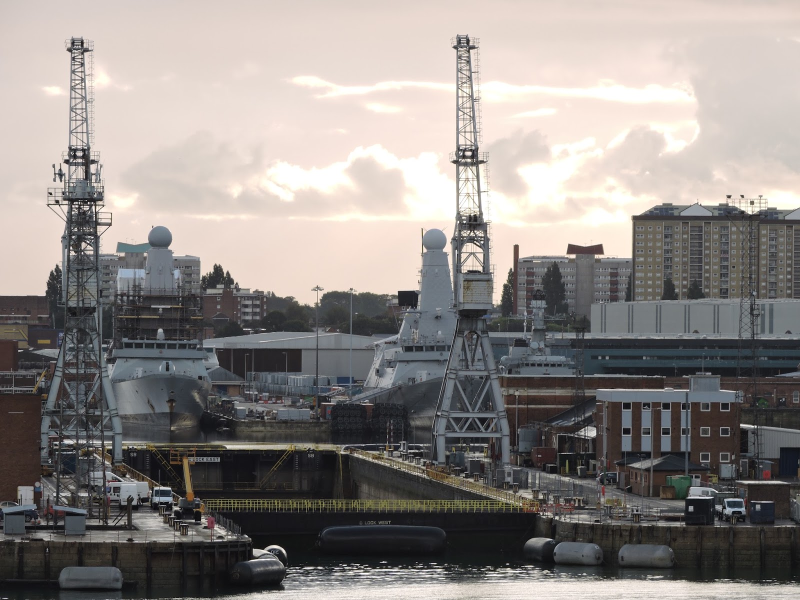 Atmospheric early morning shot into the dockyard two Type 45s in the middle ground |