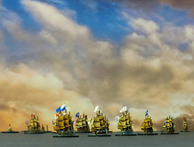Cruising off the Dutch coast - d'Estrees White Squadron with the English Red and Blue behind. |