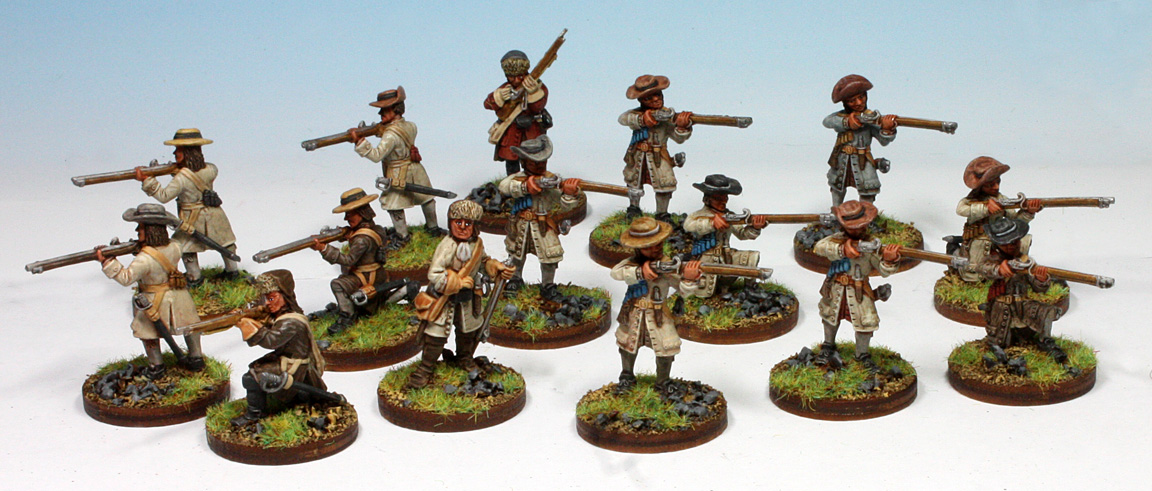 Clarence Harrison - Something that may be a bit unusual in our Pennyburn Mill for those familiar with Beneath the Lily Banners is the large number of singly based models. These represent commanded shot, detached companies, forlorn hopes and the like. The rules for these formations will be in the scenario book due out later this year...