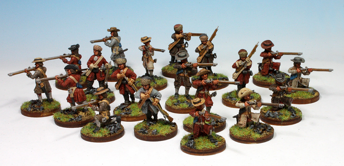Clarence Harrison - Something that may be a bit unusual in our Pennyburn Mill for those familiar with Beneath the Lily Banners is the large number of singly based models. These represent commanded shot, detached companies, forlorn hopes and the like. The rules for these formations will be in the scenario book due out later this year...