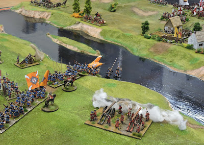 In they go! The Gard te Voet wade the river whilst Williamite guns explode! |