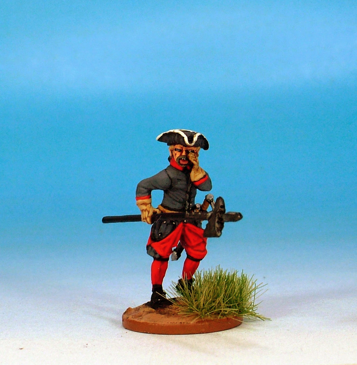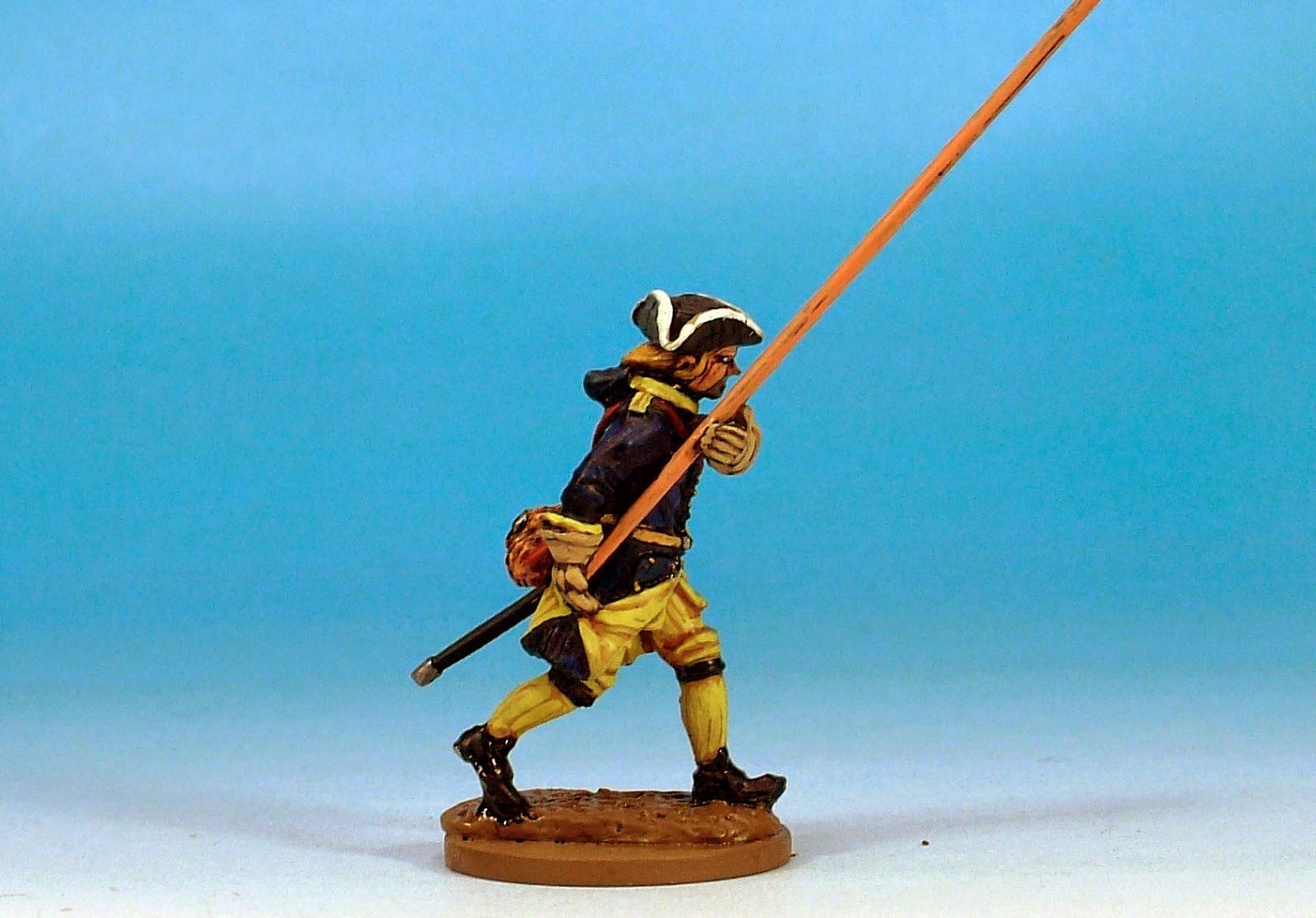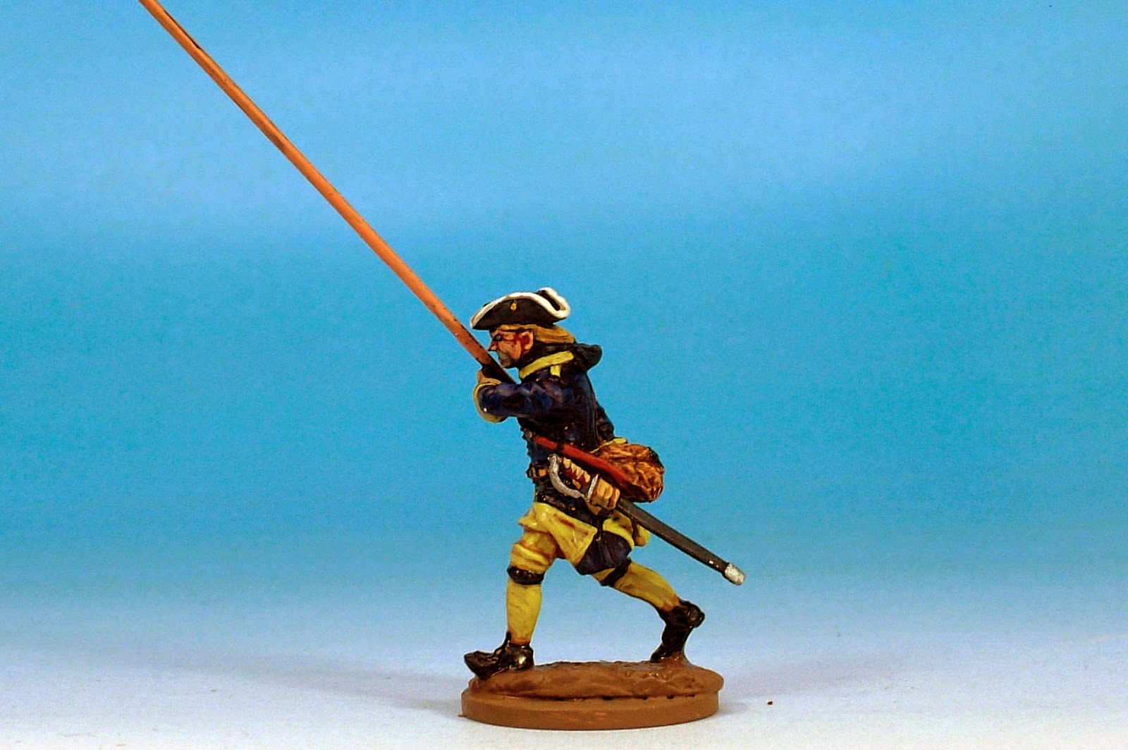 I love this code! This is the default uniform of Swedish troops of the period. Tricorned, hair-bagged with the addition of the calfskin campaign haversack. The movement that Clibinarium has managed to inject into these models is quite remarkable.