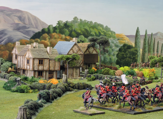 | Royal cavalry approach a hostile Somerset hamlet - the villagers are assembling on the Green |