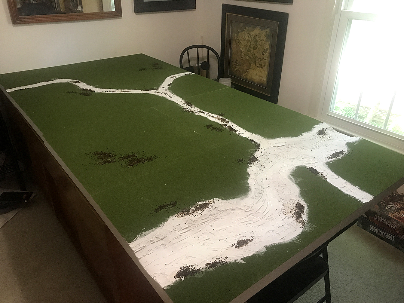 This is a very fast way to make a table. I glued all of the felt in one evening. The river and roads were carved in another and covered in joint compound. The rough texture (my usual coffee grounds) was added this morning and the glue will be dry to allow the first coat of earth paint to cover all of the white areas this evening. Not bad for three days work. This week I'll finish the painting, including the river and add additional static grass and other ground cover. The last step will be adding resin into the river bed, probably next weekend.
