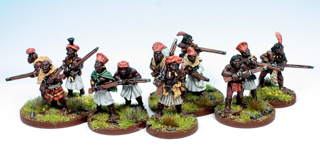 Finally, a unit I don't specifically need for my current scenario, but they fit in with the rest. These are Ruga Ruga from the Wargames Foundry 19th century range, but I intend to field them as African pirates, escaped (or freed) slaves, or simply brigands. I was careful to avoid models with Remington rifles, cartridge belts, and the like. They will probably join Morgan's crew in the final attack.
