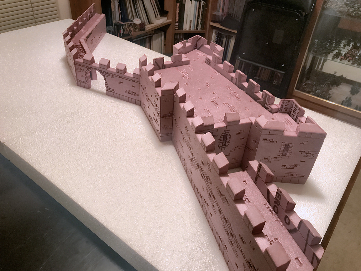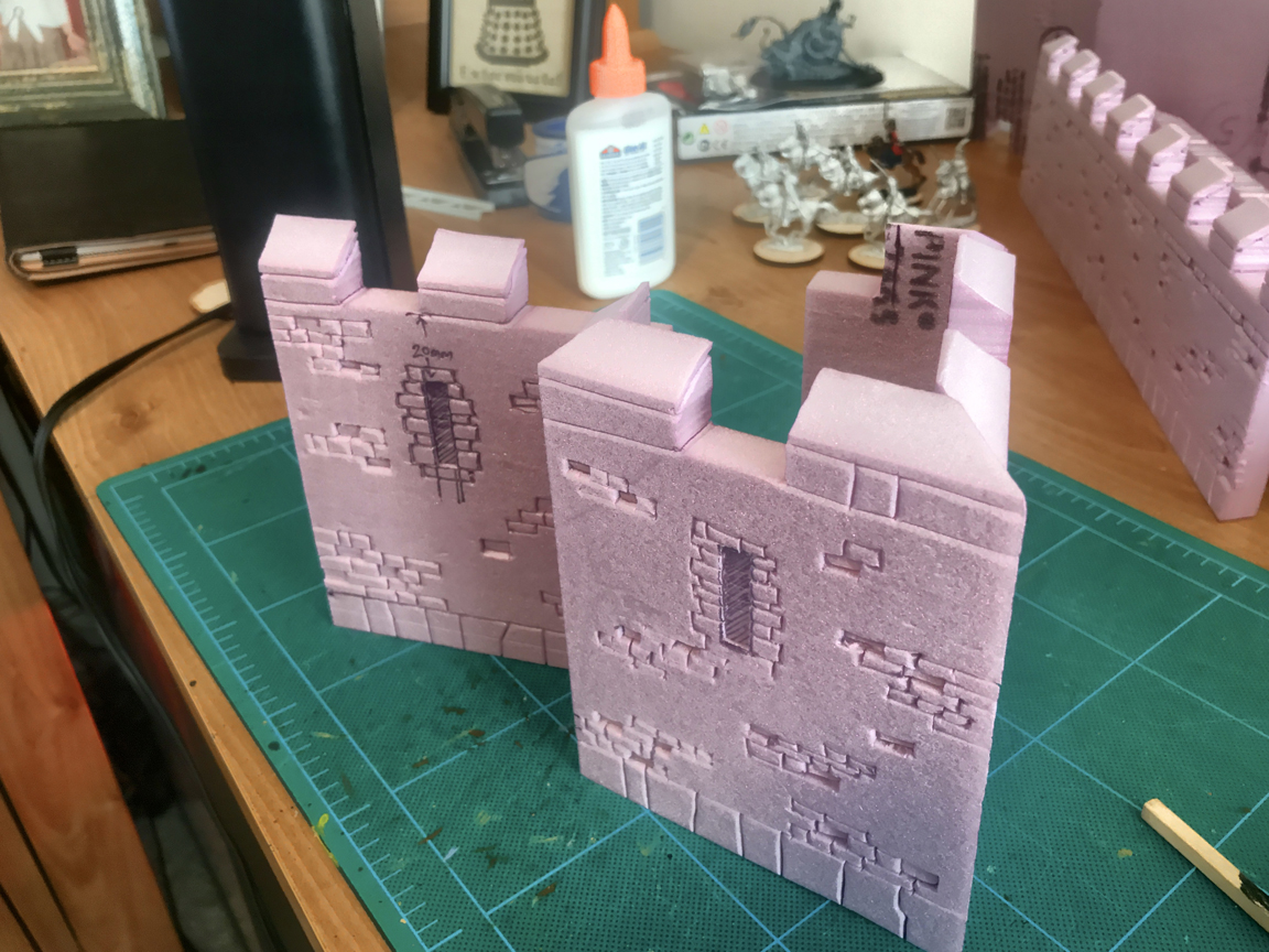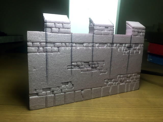 The walls were detailed by carving scattered stones with a scalple and then going over all of the cuts with a ball point pen. The pen makes a nice bevel on the edges of the stones and ensures the detail won't be filled in by the layers of paint coming up. Cutting the stones in initially with a blade means you can use a piece of balsa wood to press some of the stones into the surface which adds a cool bit of detail with very little extra effort. I'm going to add a few stones cut from slivers of foam that will stand out from the wall as well, adding yet another layer.
