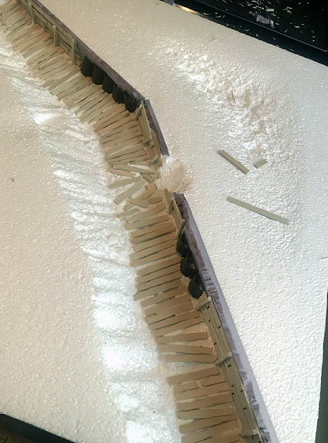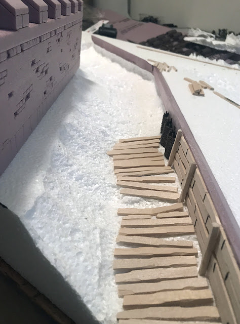 Clarence Harrison - I've made some progress on my project for the Guns of August show this summer. It is August 24th-26th and I am definitely attending, though I will only be there Saturday and Sunday. The plan is to run the game twice on Saturday and once on Sunday. I have more detail to do on the walls of Limerick, but some of that will be easier do once the models are attached to the tiles. Before doing that I wanted to build the glacis and covered way that had been constructed outside the walls. The photos aren't great because the expanse of white foam fought all efforts to get decent contrast and the results are a bit over exposed, but you can get the idea.
