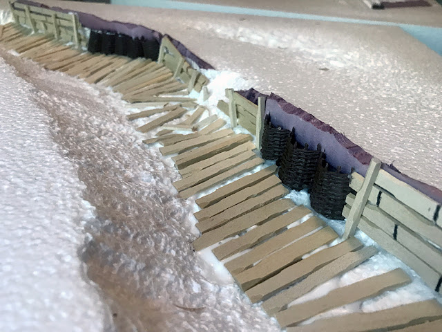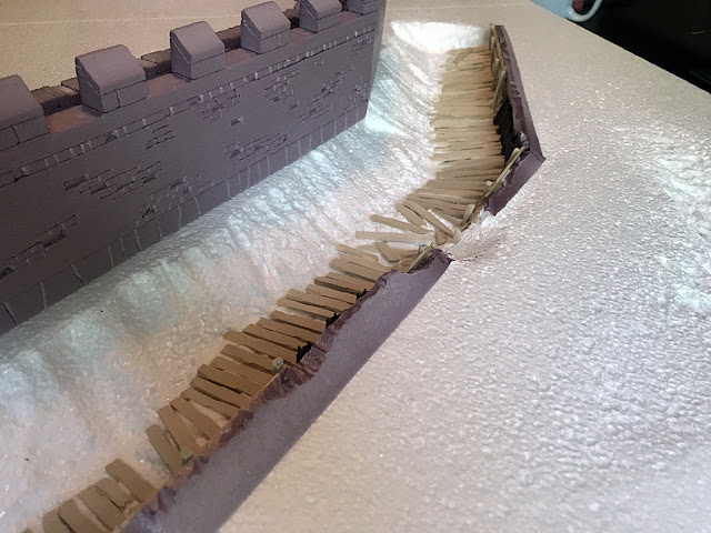 The glacis will be a longer slope when I break out the filler to blend all of these features into the board. Multiple layers of texture and scattered debris like buckets, spare timber, and fascines will all be added at some point. However, my next step is to turn my attention back to the walls, fixing them permanently to the tiles and adding another layer of detail to them.