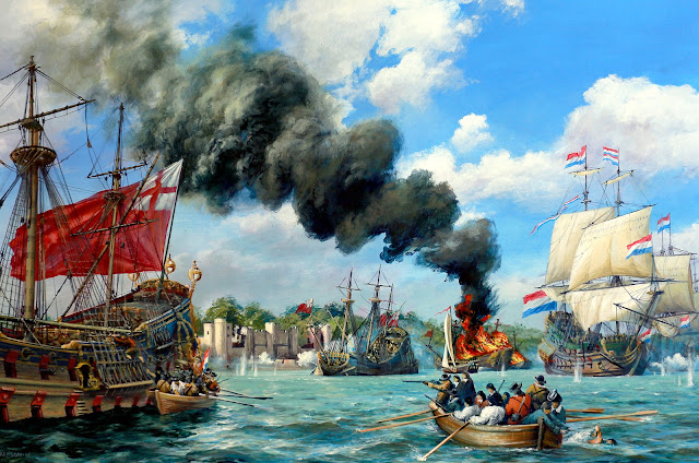 I have explained the background in a previous post - During the Medway Raid (Tocht naar Chatham) the ultimate phase was the Dutch attack on the pre-sunk men o' war anchored in the stretch of the river between Upnor Castle and Chatham Royal Dockyard.