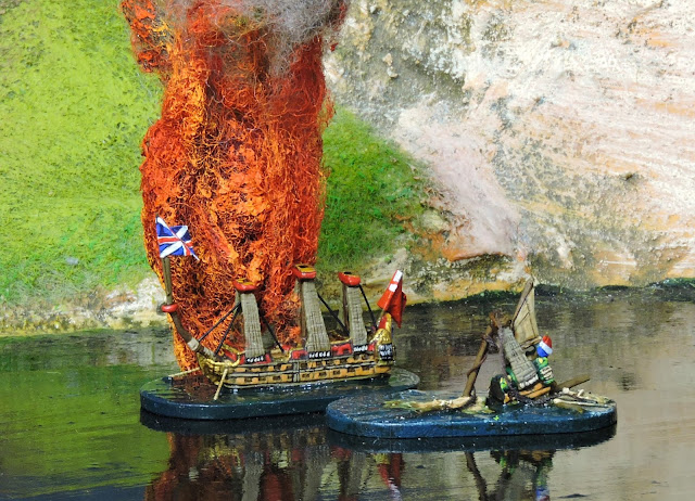 On the accumulation of a score of 21 (throw 1 x d6 each turn) the Dutch will be reinforced by a ship sailing from Upnor Reach. The Fireships have no shooting capability.