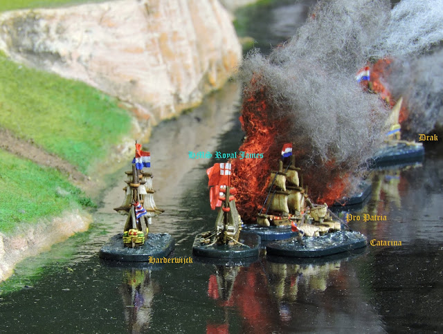 With Harderwijck sheperding both Catarina and Pro Patria, further upriver towards HMS Royal James the shore batteries continued to blast away at the attackers. The English barrage was so intense that Drak caught fire and Catarina's captain was killed when HMS Loyal London opened up on her as she sailed past towards her target. The impact of this catastrophic damage caused the crew morale aboard the fireship to drop to DRILLED. The Dutch absorbed huge punishment during this turn but pressed home their attack with resolution.