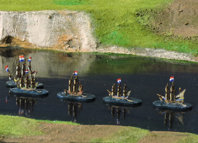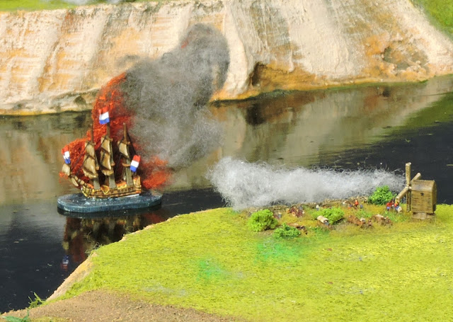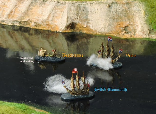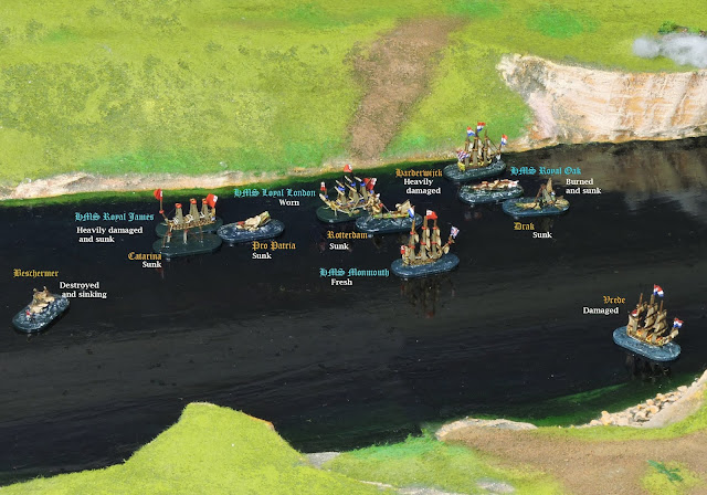 Vrede and Harderwijck manouevred out of the combat zone whilst HMS Monmouth hesitated from pursuing too far down river. The battle was over. All of the Dutch fireships were spent and sunk. HMS Royal James lay on the bottom and so severely damaged that she was likely to prove unsalvagable. HMS Royal Oak had capsized and sunk after exploding. HMS Loyal London remained relatively intact although she had taken some minor damage. Beschermer had been lost and her crew captured. By the terms of the scenario it was a very hard fought Dutch victory but the English had made much more of a fight that had been expected.