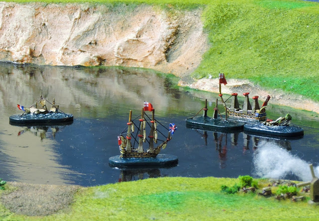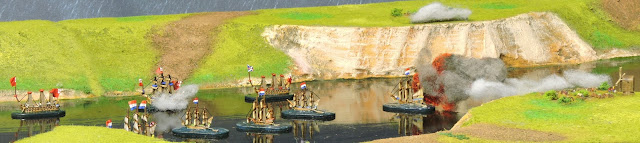 | Sailing in line astern in the narrow eastern channel the Fireships head upriver on their one way mission. |