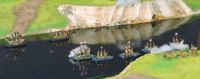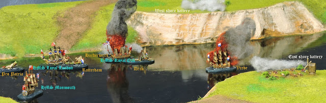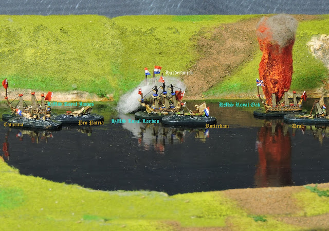 The leading Dutch veseels came under the muzzles of the shore batteries which opened up with a hot fire causing damage to Harderwijck and Catarina. The Dutch frigate returned fire against the nearer east shore as the squadron was sailing in an eastern channel. By the end of the turn Rotterdam and Drak had altered course and were pointing toward their respective targets HMS Loyal London and HMS Royal Oak.