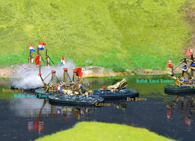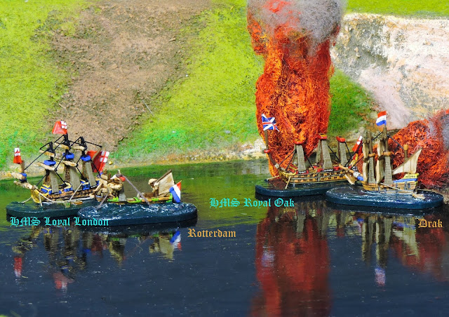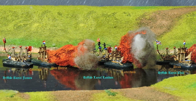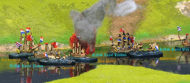 The Dutch fired Catarina, Pro Patria and Rotterdam whose crews abandoned them. The first two hit HMS Royal James but her skelton crew were able to fend off the fireships and the flames did not spread to the battleship. Pro Patria hit HMS Loyal London but again the English crew was able to fend off the attack and the flames did not catch on the battleship. The crew onboard Drak fought furiously to put out the fire started by the shore batteries that their vessel, made safe, crashed into the side of HMS Royal Oak causing minor damage to the larger vessel and much more to the fireship. Had the crew left their vessel burning it may have proved a wiser choice.
