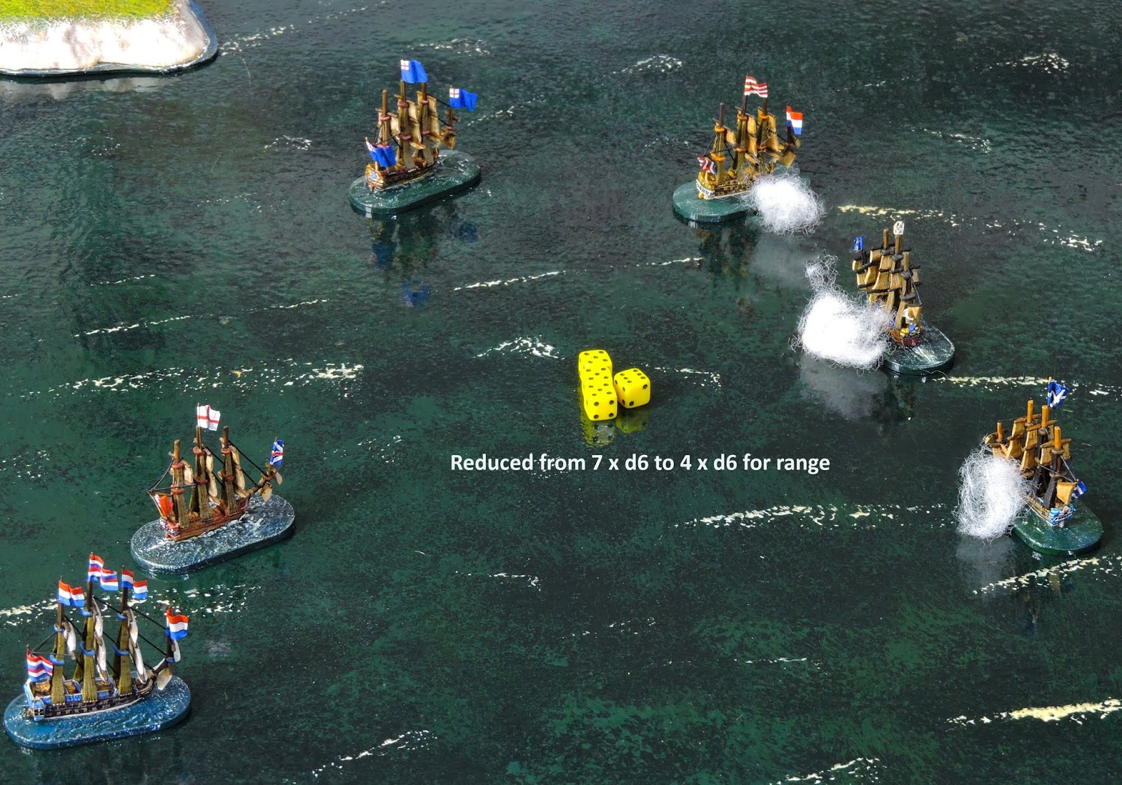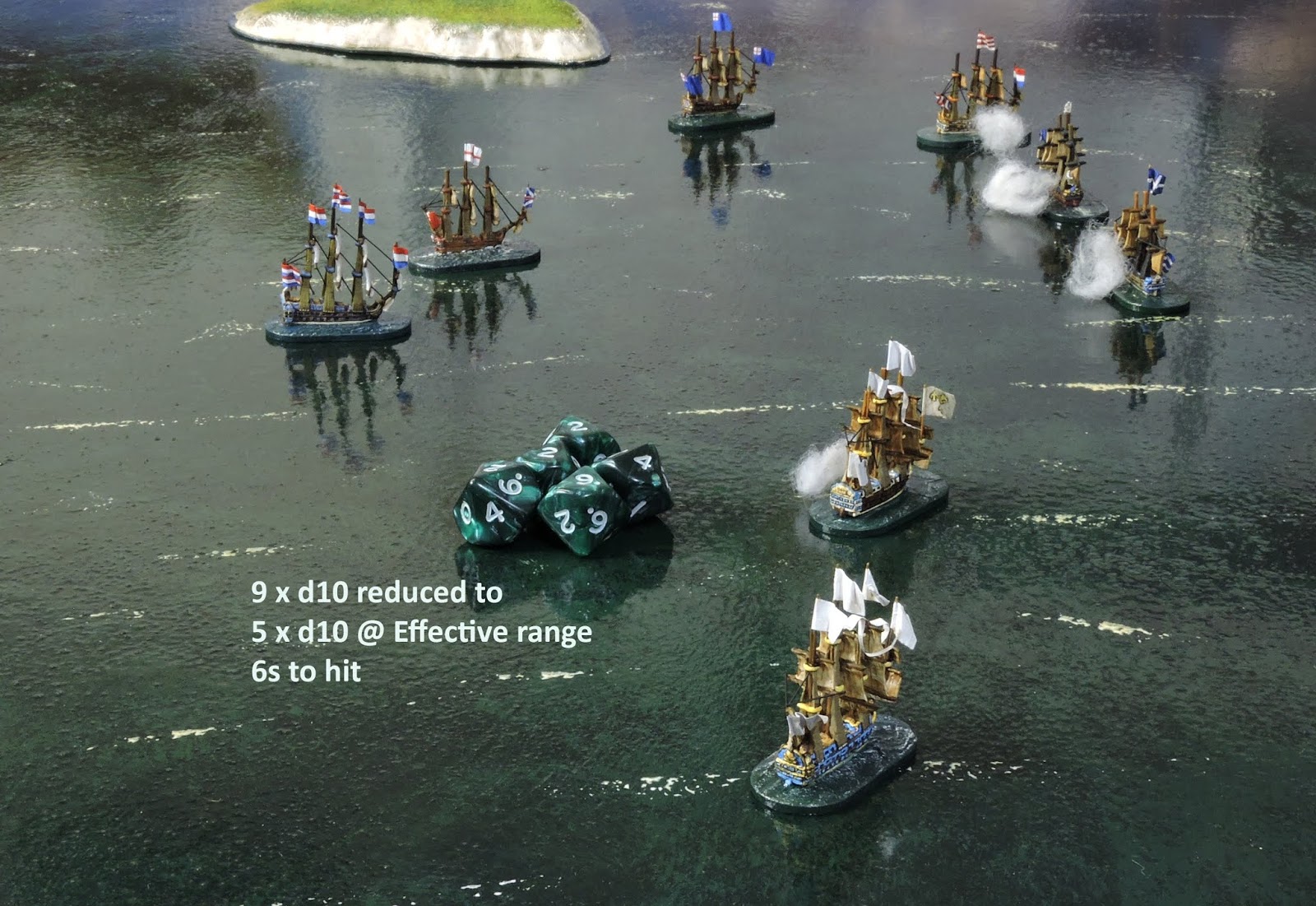 Aha! you say! That means a 1st rate at SA range fires with 20 dice? Wow!! Yes but... the to hit score is 6 not 2. With a MG and a first broadside it reduces to 4. If it is raking it gets an extra d3 dice and, if it has heavy guns it gets to re-throw half of its misses. All true - that sounds worse.. or does it?