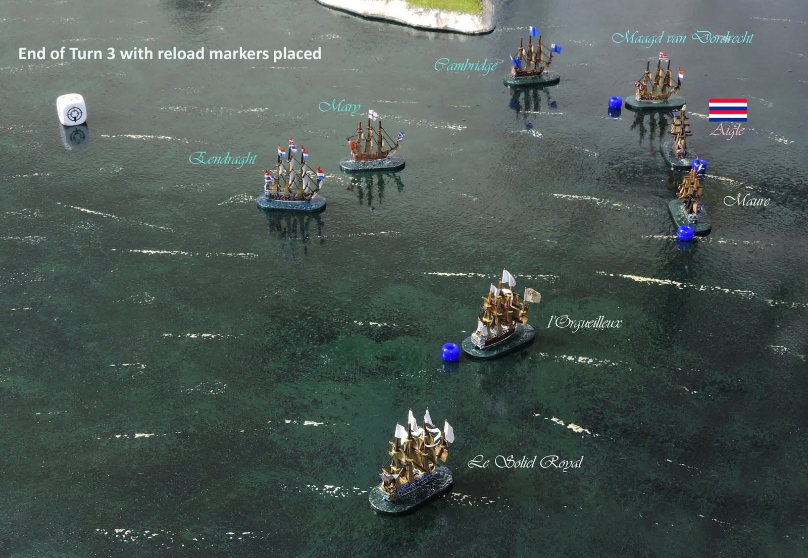 The first two turns were spent manouevring. The Allies had gained the +1 advantage on initiative, have most ships to windward +1 and in the first two roll-offs gained initiative. They actually forced the French to move first. Ship movement is alternative. In a larger game, movement by squadron would be alternative. That's a nice easy mechanic. The lighter, faster Allied ships raced to cut across the French whilst the larger Eendraght set course to intercept the big gunned and slower two vessels.