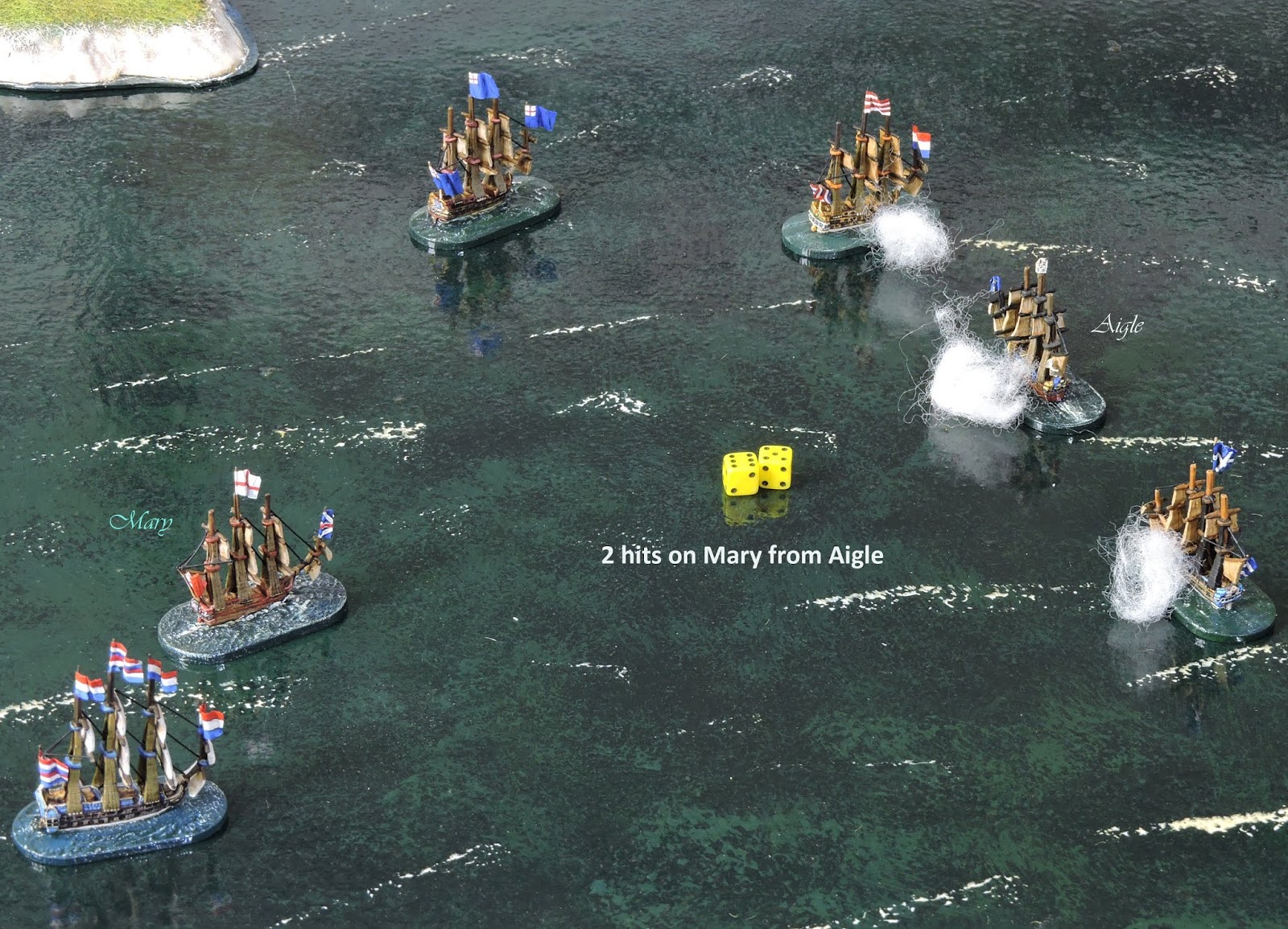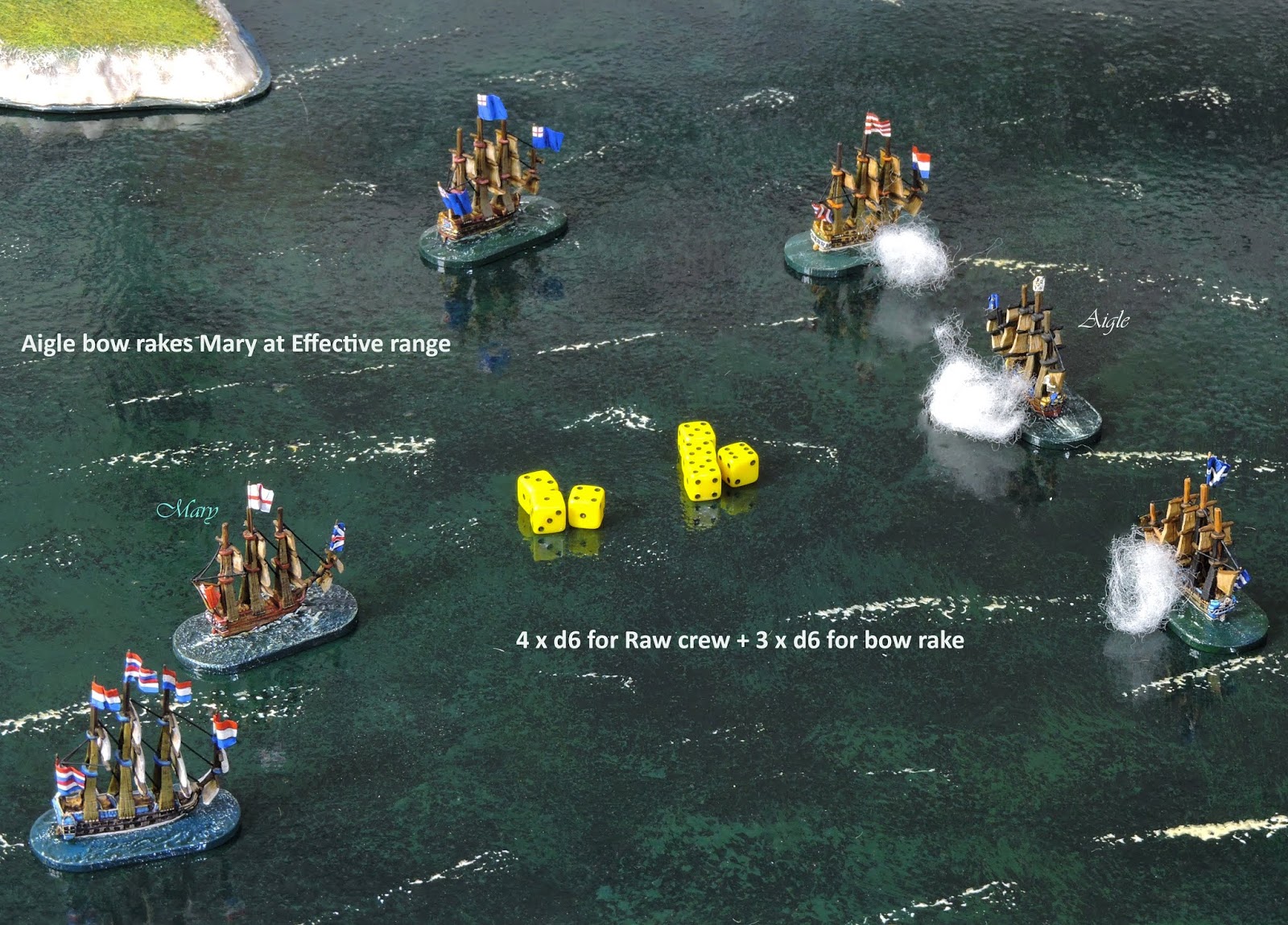 | The Raw 40 gun Aigle rakes Mary at Effective range using 7 dice. |